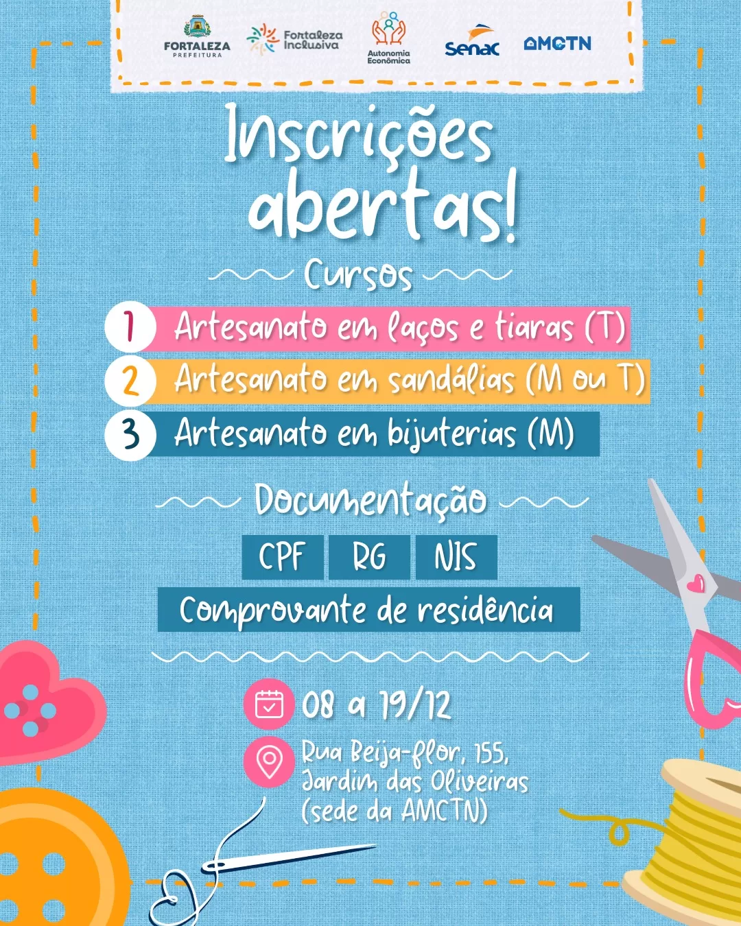 📢 INSCRIÇÕES ABERTAS! ✨O Programa Fortaleza Inclusiva – Autonomia Econômica, em parceria com a SDE, o SENAC e a AMCTN, abre uma nova oportunidade de formação para quem deseja desenvolver habilidades criativas e transformar conhecimento em geração de renda.Nesta edição, o foco é o universo da customização — uma área que combina arte, estilo e empreendedorismo. Ao participar, você terá acesso a técnicas práticas, orientações profissionais e caminhos reais para ampliar sua autonomia econômica através do trabalho criativo.